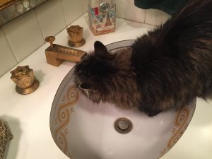 Kitty has free will. Sometimes she drinks and then hops down. Other times, as soon as I set her on the sink, turn on the water, off she goes, down to the floor. Sometimes I become like Kitty. I reach out to God in prayer or silent thought in my head. He hears (for He always hears) and is ready to lift me up but I must act. I don’t have to “meow” but I must turn on the hearing aid and listen.