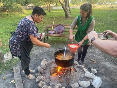 While in Romania, we also participated in a wonderful lunch prepared by local women of a small village church near Brasov. As we arrived, a large, black, iron pot, containing chicken and various vegetables, was bubbling over a small, outdoor fire. Two cooks were adding to the mix. A thickening substance was stirred in. Then the special ingredient, so commonly found in the foods of this country, was sprinkled over the surface. Some of you may anticipate that final touch — paprika.