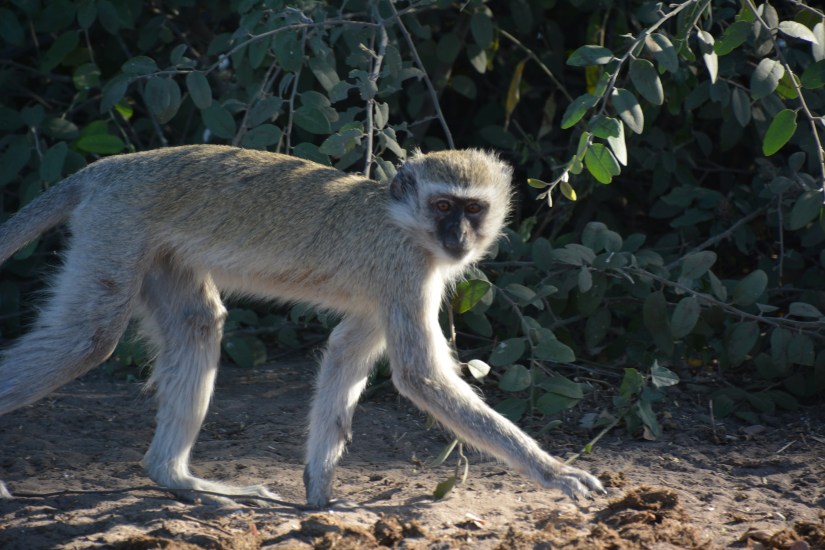 One never knew where the mischievous monkeys would pop up. In fact, one day, we heard the staff suddenly begin to scream, wave napkins, and even get out a sling shot. Peeping out from the tree branches near our snack table that afternoon, was a cluster of the speedy, little thieves. Before one could blink an eye, one monkey was on our picnic table scooping up salad from a plate. Fortunately it was not my plate, thus allowing me time to snap a photo of the crazy, hungry visitor.